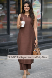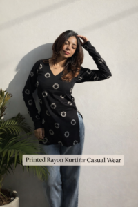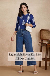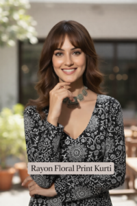 Rayon floral kurtis lightweight aur flowy hoti hain. Soft fabric aur elegant prints inhe long hours ke liye comfortable banate hain. Daily routine ke liye ye ek popular option hai.