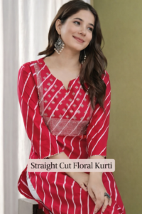 Straight cut floral kurtis classy aur neat look deti hain. Ye leggings, jeans ya palazzo ke saath easily style ho jati hain aur college ya office ke light days ke liye suitable hoti hain.