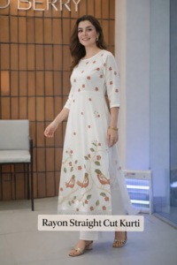 Rayon straight cut kurtis lightweight aur flowy hoti hain. Ye long hours ke liye comfortable hoti hain aur daily wear ke liye best option mani jati hain.
