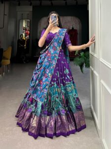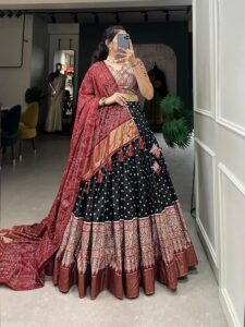 Kutch embroidery is famous for its rich designs and colorful threads. Wearing a Ghagra with Kutch embroidery will make you shine in any Dandiya night. Pair it with a short blouse and dupatta, and don’t forget heavy jhumkas for a complete ethnic vibe.