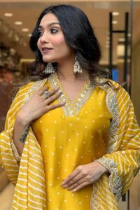 A floor-length Anarkali is elegant and flowy, giving a regal appearance. It’s perfect if you want something less heavy than a lehenga but equally festive. Pair with statement earrings and juttis for a classy Navratri look.